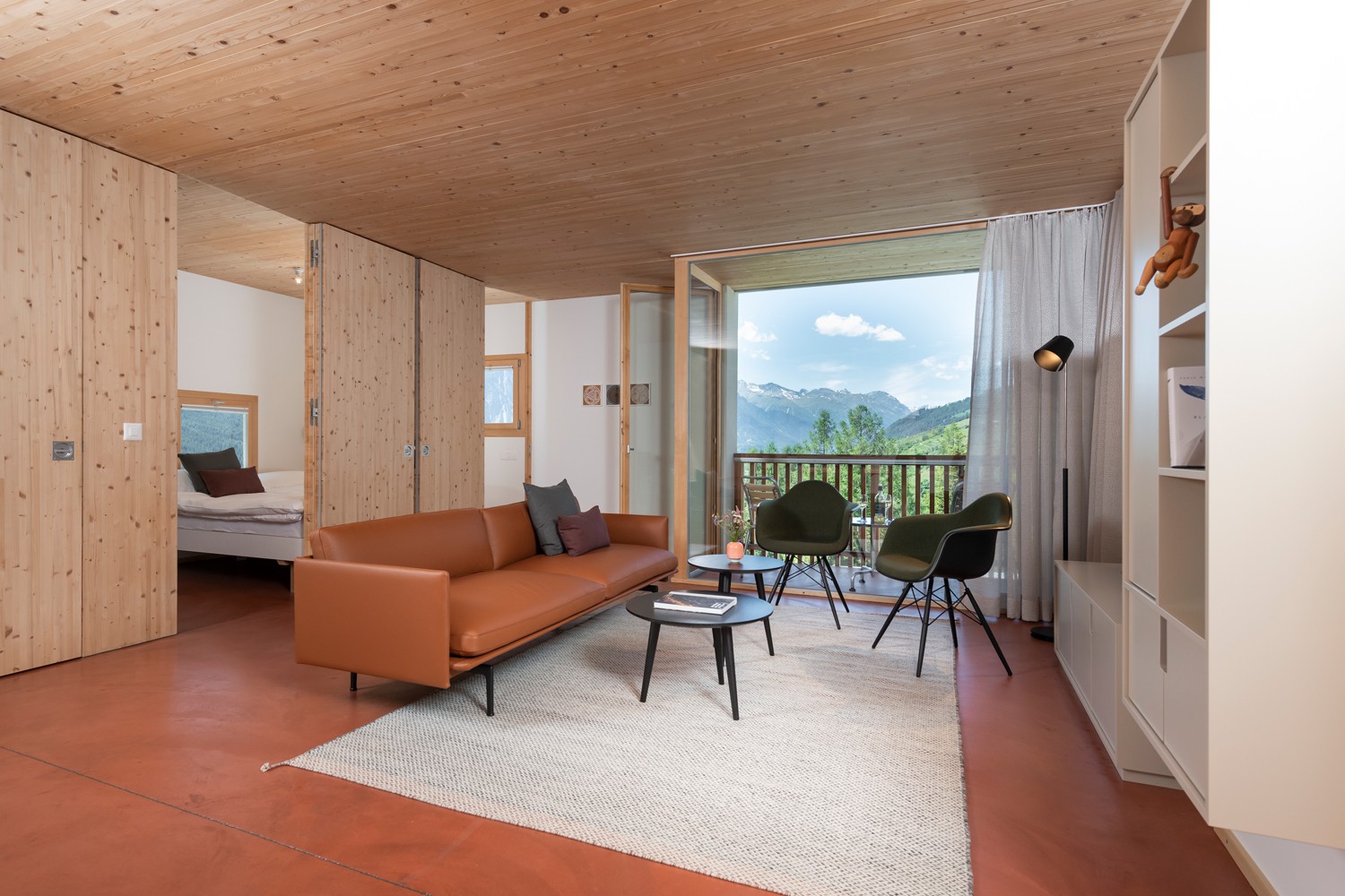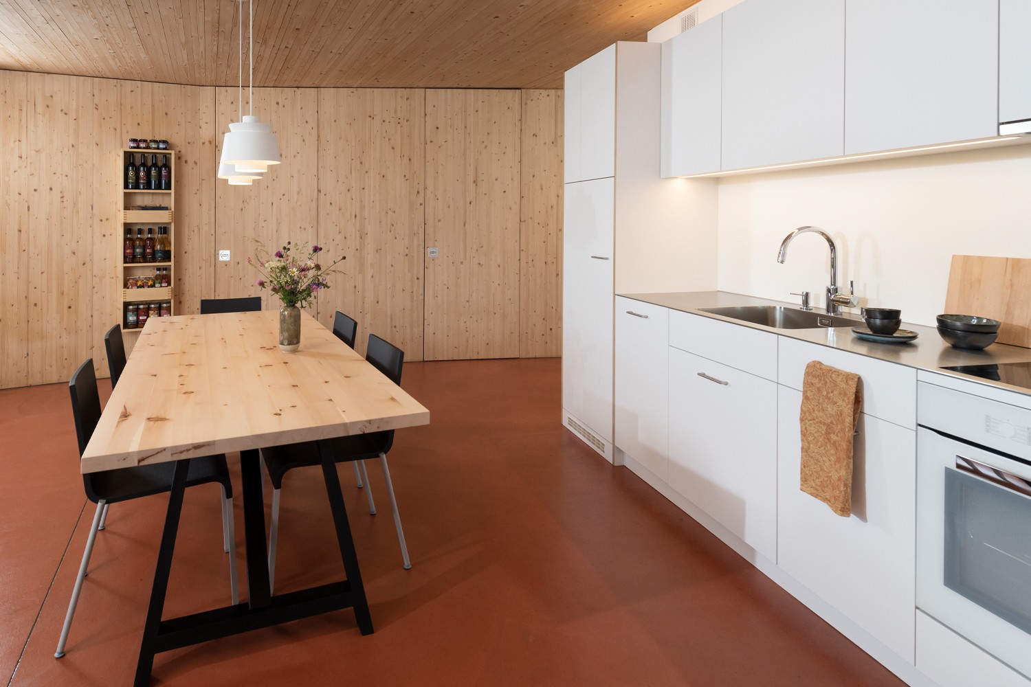 Ein besonderer Hingucker ist der Mini-Kiosk in jeder Wohnung: Er wird mit Produkten des Archehofs bestückt und ermöglicht den Gästen, sich während ihres Aufenthalts direkt vor Ort zu bedienen. Das dafür entworfene Wandregal wurde vom örtlichen Schreiner gefertigt und lässt sich flexibel an Grösse und Art der Produkte anpassen. Ergänzend entstanden zwei weitere massgefertigte Möbelstücke, die praktischen Stauraum für Lebensmittel, Broschüren und Küchenutensilien bieten, für die in der kleinen Küche sonst kein Platz wäre.