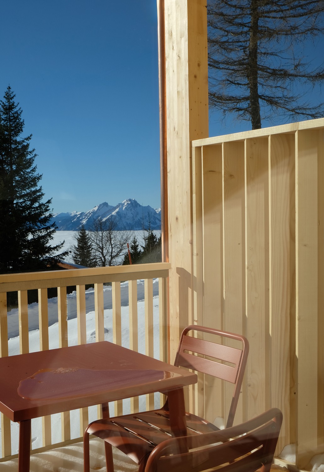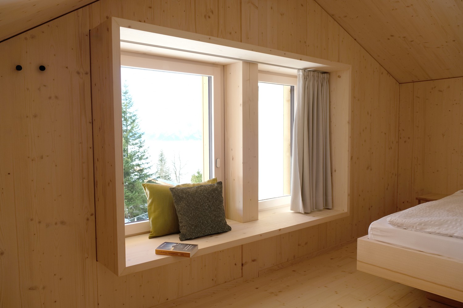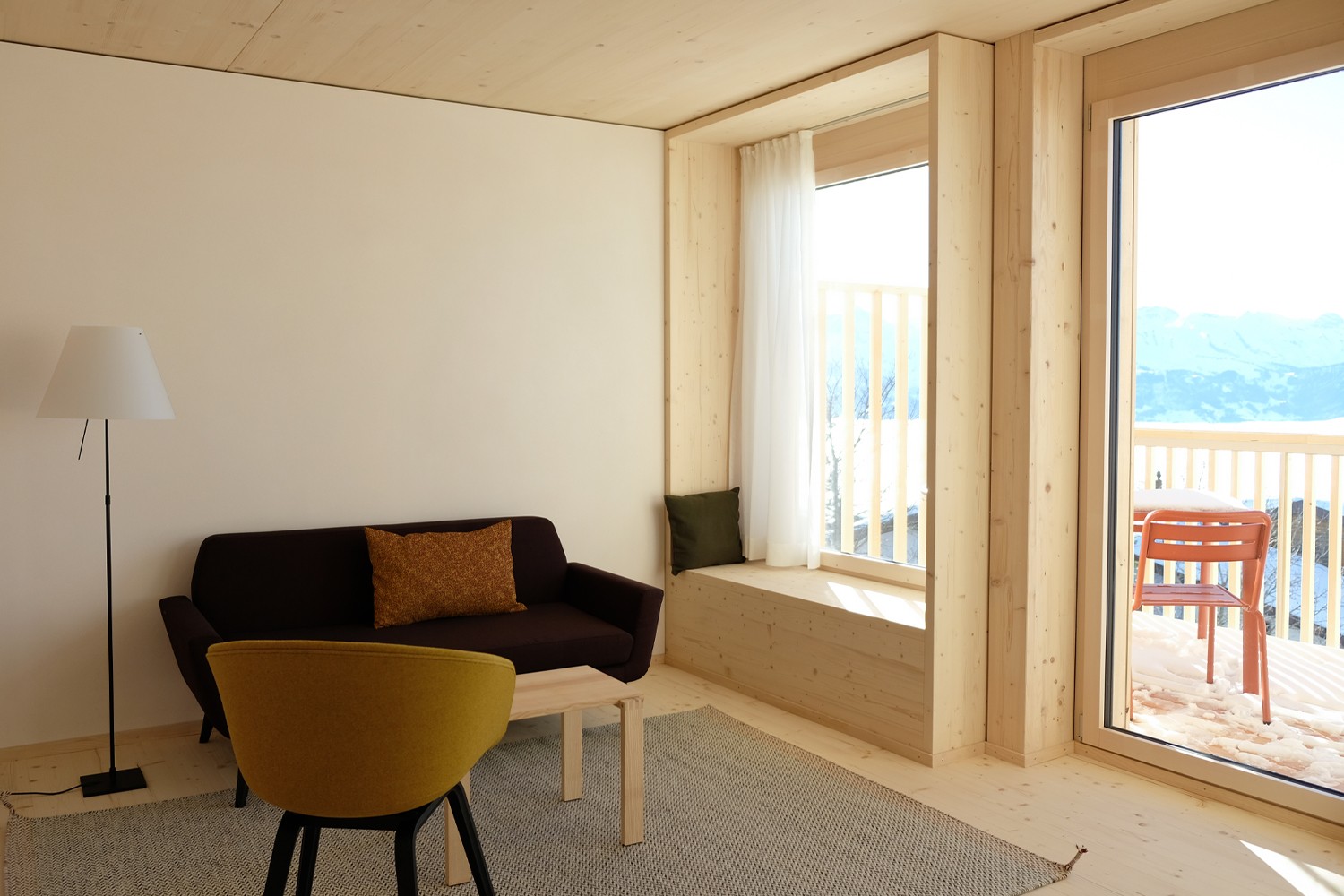 Auf Rigi First auf 1’400 m ü. M. wurden Ende 2024 vier 2,5-Zimmer- und fünf 4,5-Zimmer-Maisonettewohnungen realisiert, die seit Anfang 2025 als Ferienwohnungen vermietet werden. Das Projekt basiert auf ökologischen Grundsätzen: gebaut aus einheimischem Holz, gedämmt mit Stroh und im Innenraum mit Lehm verputzt.