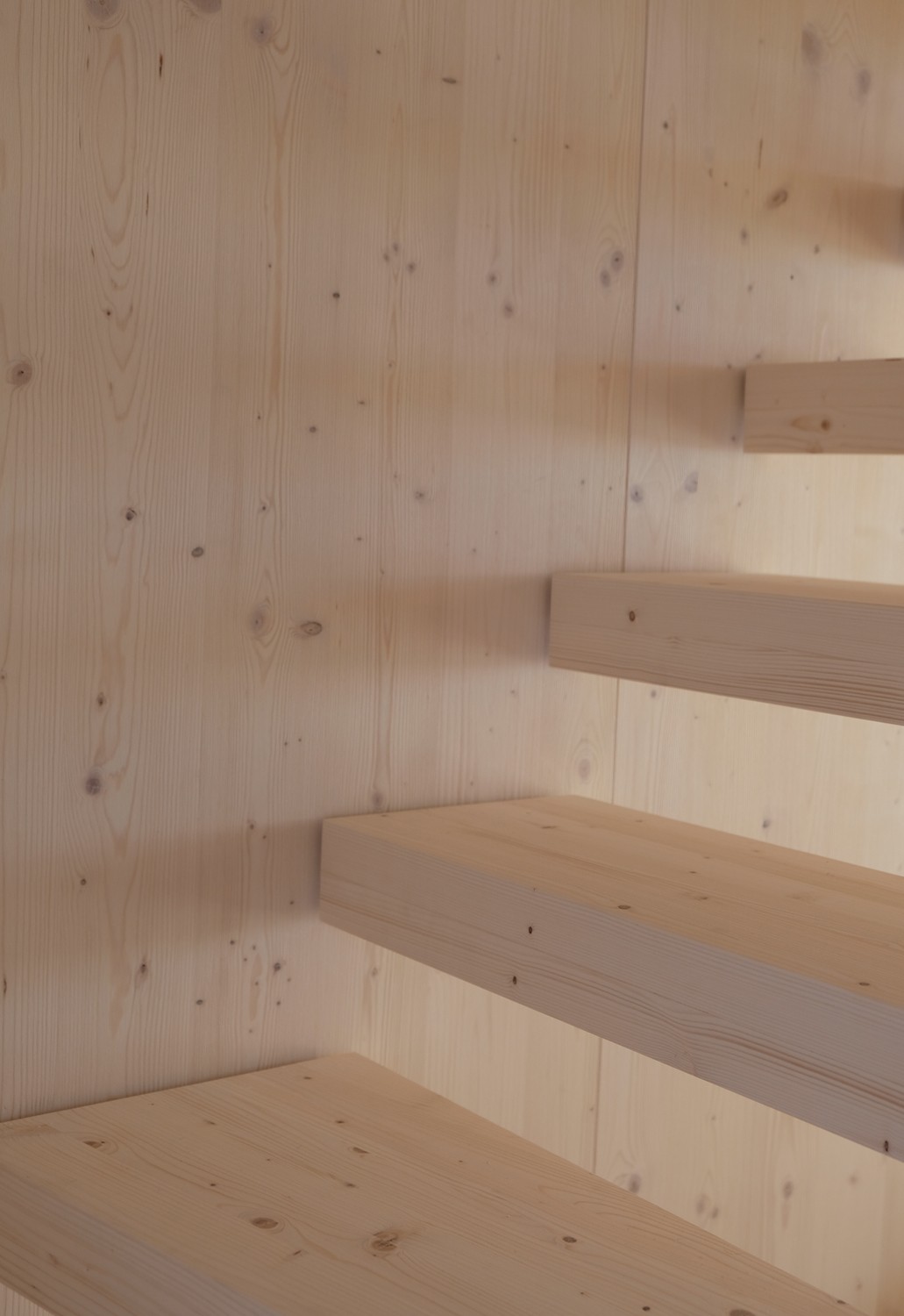 Durch die Wahl natürlicher Materialien entsteht eine Bauweise, die Nachhaltigkeit und hohen Wohnkomfort verbindet. Hervorzuheben sind die Küchen und Möbel, die leimfrei sind und aus einheimischem Mondholz entstanden. Die Umsetzung erfolgte in Zusammenarbeit mit Schmidlin Holzbau, Steinen.